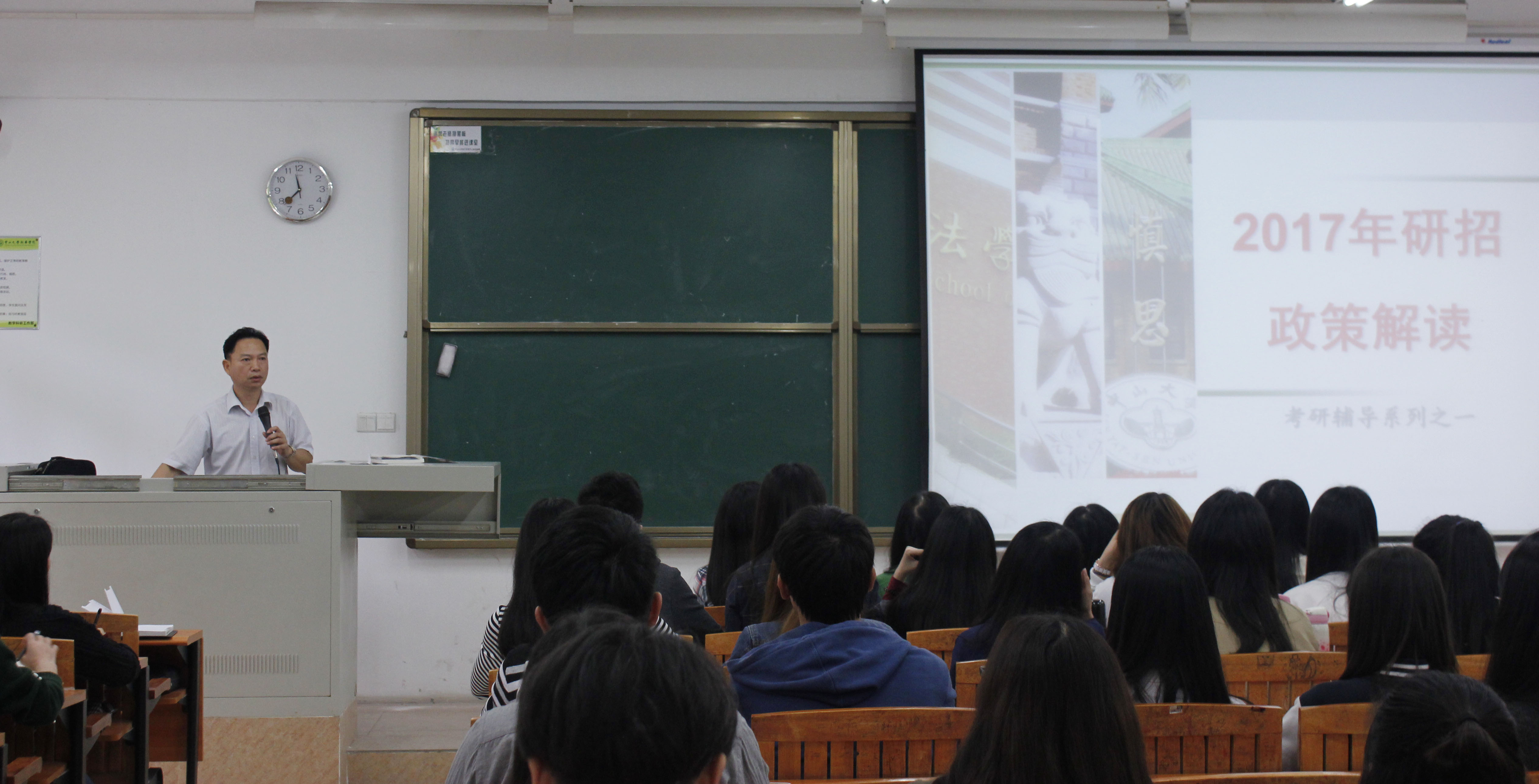 为帮助有意继续深造同学们正确选择专业(法学硕士、法律硕士)及院校、备考和应考,我系对拟报名参加2017研究生入学考试的同学进行《2017考研辅导》的系列培训。2016年4月12日中午,由系主任李正华教授于东莞校区定静楼-B201课室举办了系列辅导的第一次《2017年研招政策解读》的培训,此次辅导受到了同学们的广泛欢迎,2013级同学有100多人参加了该次辅导。