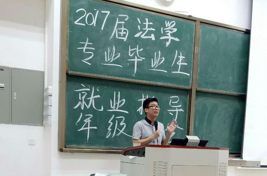 大会伊始,吴宇老师以“毕业只是开始,而不是结束”作为开场语,他表示:大学毕业绝对不是你们青春的散场,而是你们激情青春的一个崭新开始。吴老师的话语赶走了同学们临近毕业的不适应与慌张感,使我们更有勇气直面未来的挑战。接着吴老师分析了几个比较重要考试阶段,分别是11月的国考、1月的考研、以及4月份的省考。此外,老师还以自己的亲身经历向我们讲述了毕业简历的重要性以及教导我们投简历的方法。最后他预祝同学们都能找到心仪的工作,为国家的法治进程增添一份贡献。