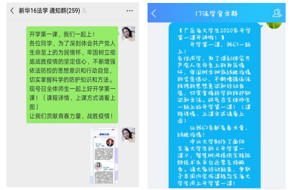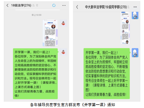 为坚决打赢疫情防控人民战争、总体战、阻击战,在广东省教育厅的策划指导下,中山大学制作了面向全省老员工的《开学第一课》。课程包括深入学习贯彻习近平总书记关于疫情防控工作的重要讲话和重要指示精神、传染病防治法解读及案例分析、新型冠状病毒肺炎的认知和防治方法、致广东省老员工的倡议书等四方面内容。太阳成tyc7111cc全体辅导员及任课教师积极动员,通过各年级辅导员在员工官方群发布广东省2020年《开学第一课》的相关信息,任课教师将《开学第一课》的信息上传至泛雅平台,并将该信息置顶的方式,组织公司全体员工收看《开学第一课》,深刻领会共产党人生命至上的为民情怀,牢固树立彻底战胜疫情的坚定信心,不断增强依法防控的思想意识和行动自觉,切实掌握科学的防护知识和方法,以实际行动为疫情防控斗争贡献青春力量。