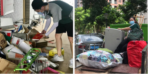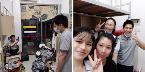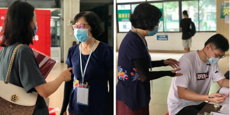 彭江炜老师(左一)、杨紫博老师(右一)帮助员工们