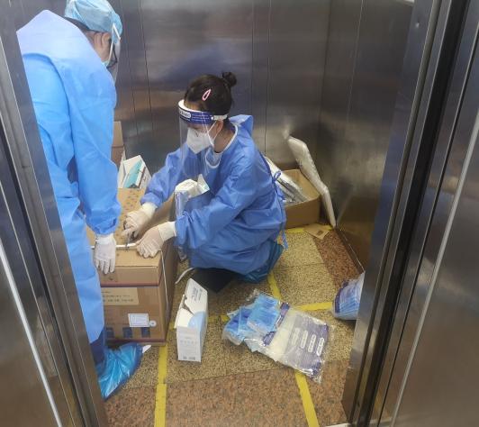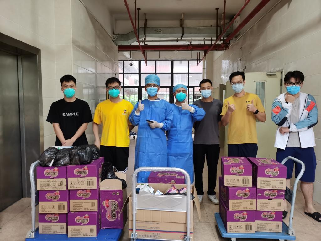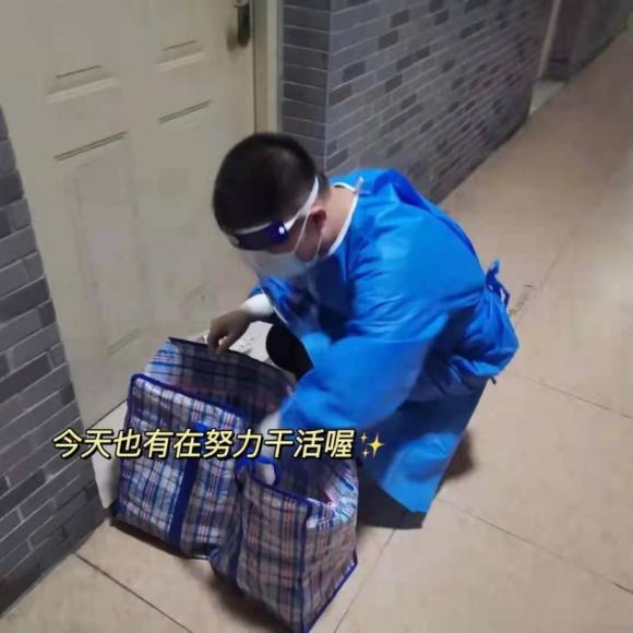 (志愿者将物资配送到宿舍门口) (志愿者进行防疫物资派发)
