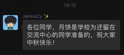 辅导员杨紫博老师为18级留校隔离同学送上中秋祝福