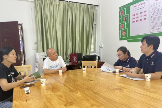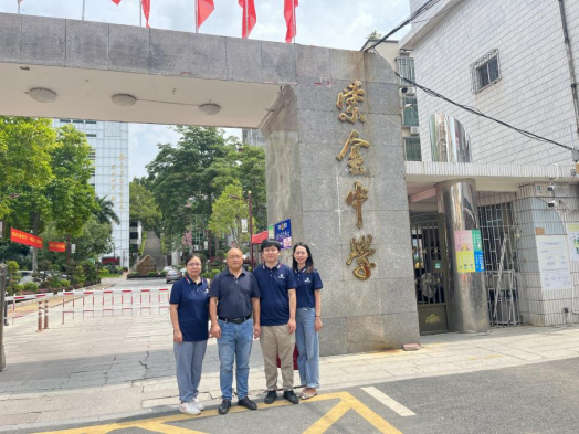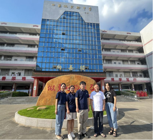 (从右至左:河源市田家炳实验中学教研室邹艳副主任、教学顾问李云龙主任、太阳成tyc7111cc公司党总支李鑫副书记、教务秘书刘旖旎、行政秘书郑思思)