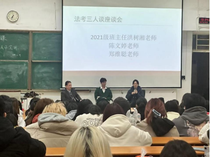 2021级班主任洪树湘,专任教师陈文婷、郑维聪三位老师以“法考”为主题为同学们举办了“法考三人谈”座谈会。会上,三位老师先后发言,交流讨论法考和考研的经验。洪树湘老师认为,法考备考时应针对个人情况了解院校概况等信息,坚定意志,保持专注、自律并做好备考计划,多前往自习室学习。陈文婷老师认为,备考可视作项目管理,分为启动、计划、实施、监控与管理和收尾五个环节。通过分解计划,设定目标,及时调整心态,提高有效学习时间,才能长久进步。郑维聪老师认为,同学们需明晰法考和考研的目的,学会接受失败,才能越挫越勇。法考虽难,但不需妖魔化,需要讲究技巧。客观题避免投机取巧,用主观题的方法去做,学会放弃实在学不会的知识点。最后,老师对同学们在提问环节为员工们进行了解答,现场气氛活跃。