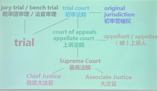 随着上课铃声响起,黄晓晴老师步入教室,开始了她的“法律英语”公开课。课堂上,黄老师首先用10分钟时间带员工们回顾了上节课的内容。随后,黄晓晴老师提出,今天的课程刚好是学期的一半,希望同学们将目前已经学习过的内容进行整体性的整理,并向同学们引入了关联记忆法。黄老师以“Trial”一词为例,从庭审/审判逐渐延伸至法院系统、法官、当事人称呼以及不同审理方式等内容,生动的展示了关联记忆法的内容。