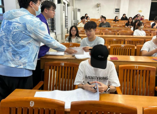 宪法知识竞赛正式开始,工作人员分发试卷后,同学们开始作答。