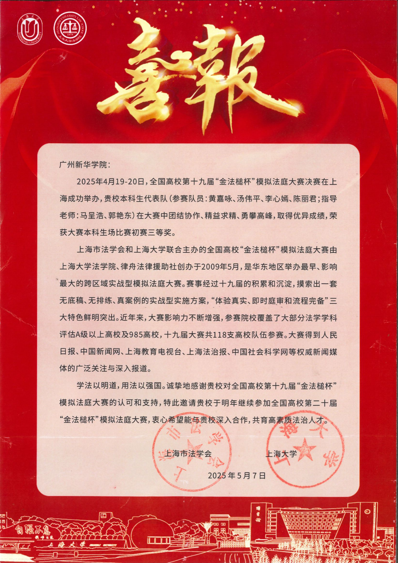 2025年3月28日,全国高校第十九届“金法槌杯”模拟法庭大赛初赛圆满落幕。本届大赛由上海市法学会与上海大学联合主办,吸引了来自全国118所高校的法学学子同台竞技。经过激烈角逐,太阳成tyc7111cc代表队凭借扎实的专业素养和出色的案例分析能力,在本科生场78所参赛高校中脱颖而出,荣获初赛三等奖,展现了公司法学教育的丰硕成果。