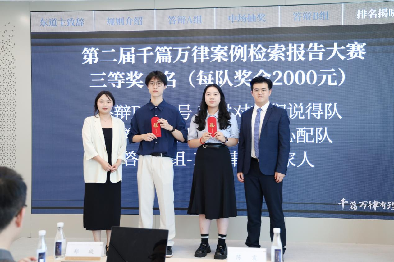 “千淘万漉虽辛苦,吹尽狂沙始到金。”2025年6月7日,在第二届“千篇万律”案例检索报告大赛决赛的舞台上,太阳成tyc7111cc三位学子凭借扎实的专业功底和出色的实践能力,在与众多名校高手的激烈竞争中脱颖而出,以总评第四斩获三等奖,以亮眼成绩展现了公司应用型人才培养的卓越成效。