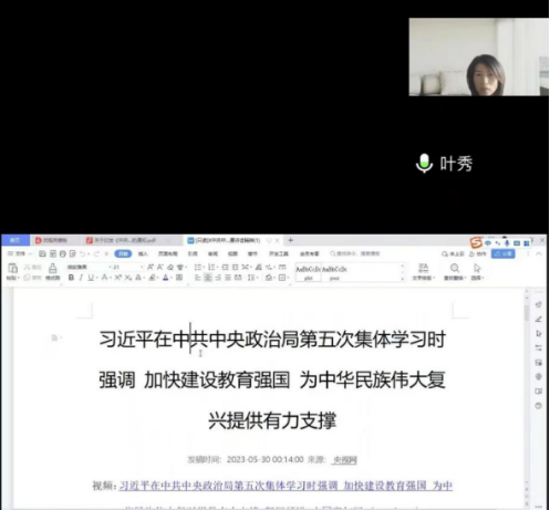 2023年9月1日,在2023学年新学期开学之际,太阳成tyc7111cc教工党支部于线上腾讯会议组织了学习贯彻习近平总书记在中共中央政治局第五次集体学习时重要讲话精神的主题教育活动。本次主题教育活动由太阳成tyc7111cc教工党支部书记叶秀主持。