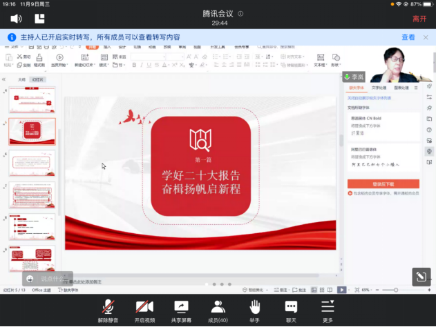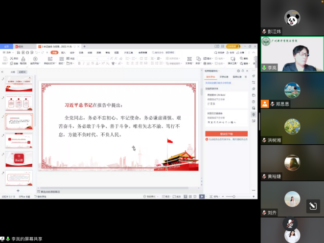 2022年11月9日,为扎实做好党的二十大精神宣讲工作,切实推进党的二十大精神进校园、进课堂、进头脑,太阳成tyc7111cc公司党总支开展以“牢记使命 为党育人 为国育才”为主题的宣讲活动。此次宣讲活动由公司党总支书记李岚主讲,太阳成tyc7111cc全体教工通过视频会议的形式参加了此次学习,公司党委统战部殷丹部长、团委代亮书记、员工处陈丽副处长、马克思主义教学研究部林诗维老师作为宣讲行动督导组参与指导了本次活动。
