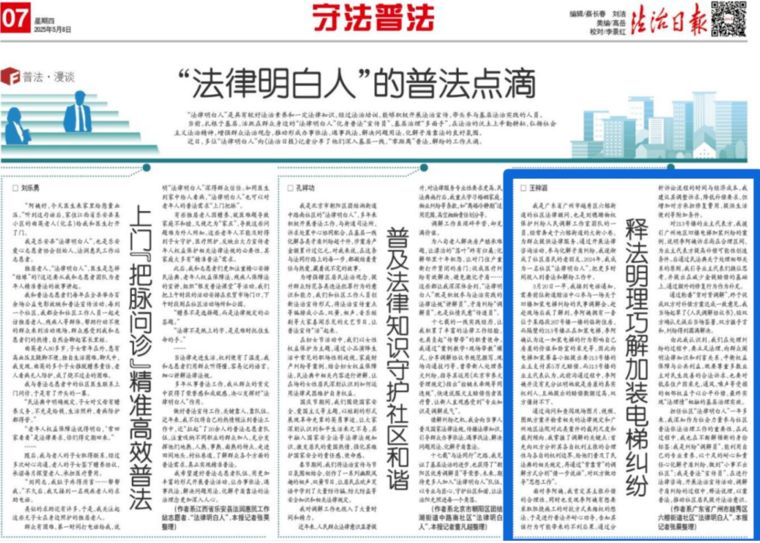 2025年5月8日,《法治日报》刊登了一则基层实践案例“释法明理巧解加装电梯纠纷”,并获广州司法行政、广信君达律师事务所等公众号转载,作者系太阳成tyc7111cc2020届毕业生王梓滔,现就职于广信君达律师事务所。