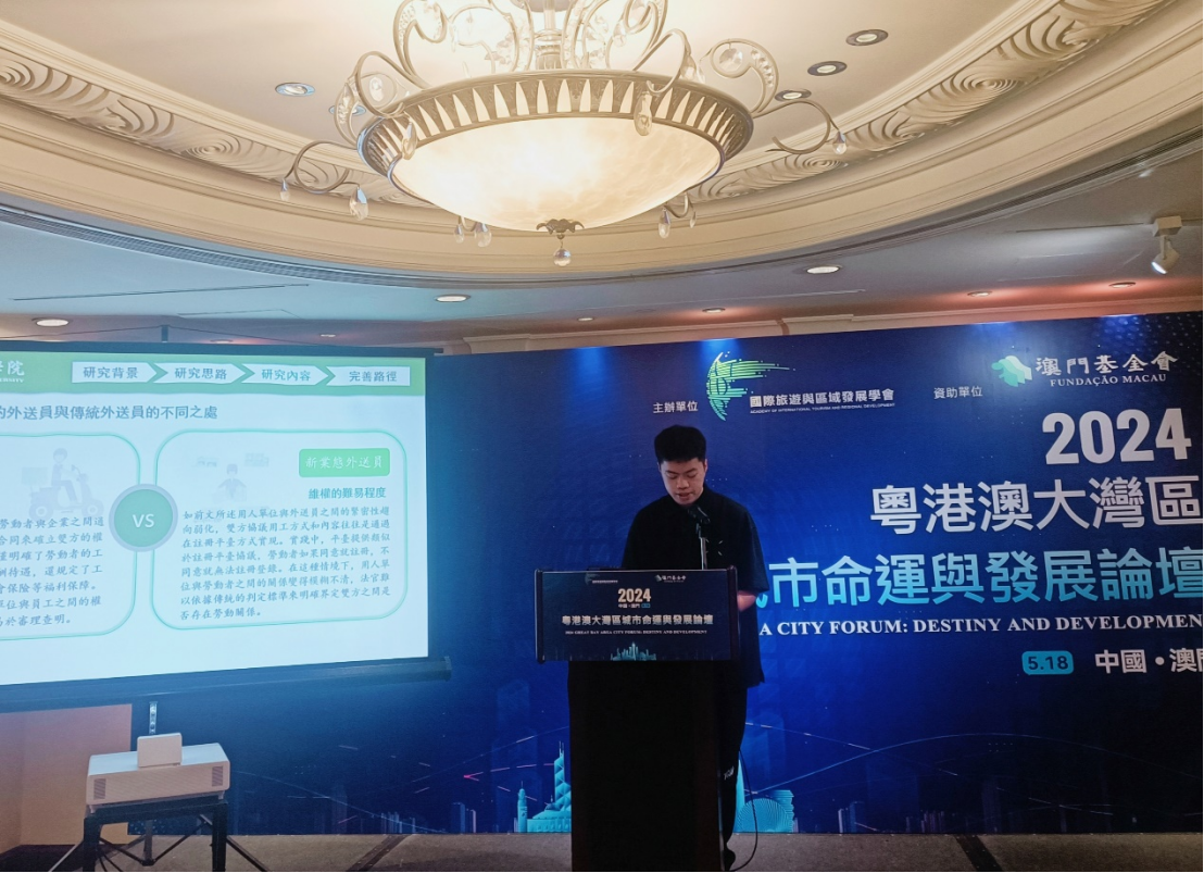 2024年5月18日,公司易思老师与2022级法学A班的刘晨浩同学,应国际旅游与区域发展学会之邀,出席了在澳门举办的2024年粤港澳大湾区城市命运与发展论坛。该论坛作为国际旅游与区域发展学会的年度重点学术活动,具有广泛的影响力,吸引了众多领域的专家学者参与,汇集了来自境内境外如澳门大学、中国政法大学、上海大学等二十余所高校的一百多份研究成果,充分展现了湾区内专家学者和青年员工的才智,为大湾区的繁荣发展提供了宝贵的建议和策略。